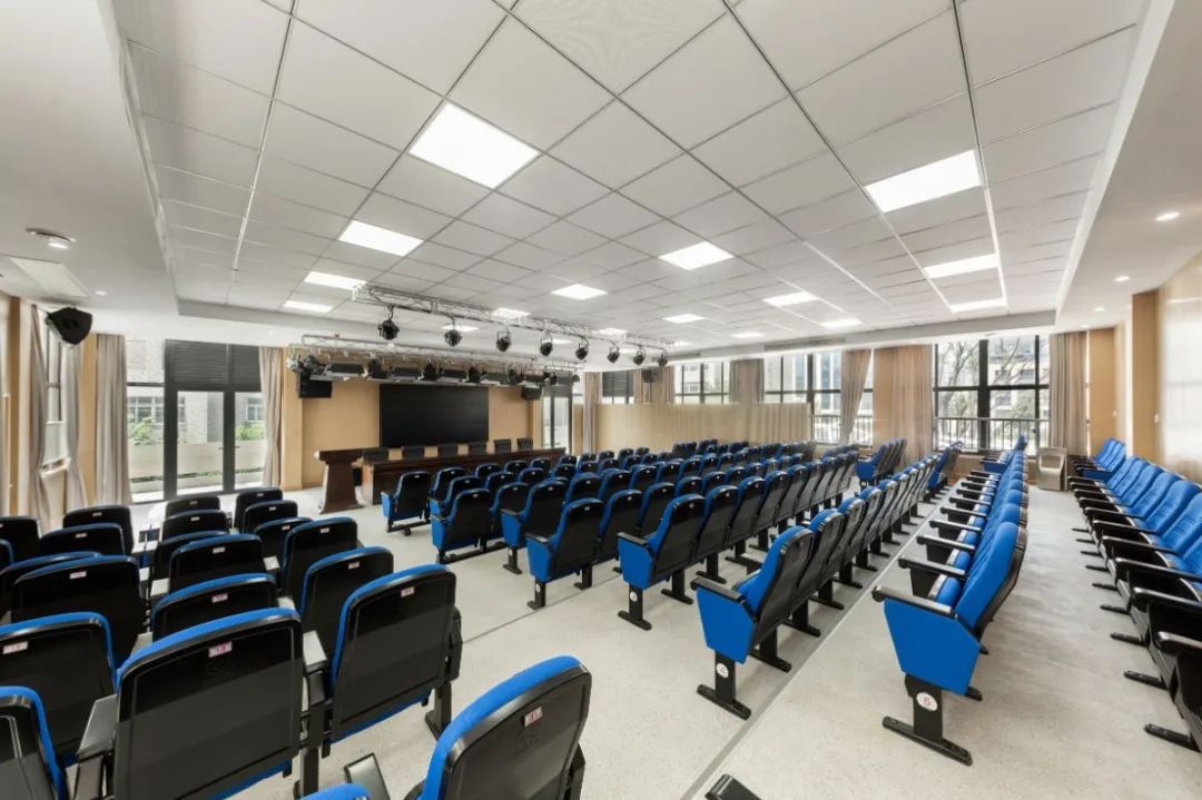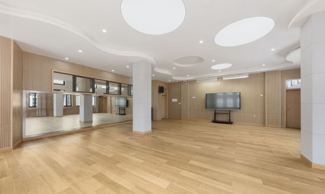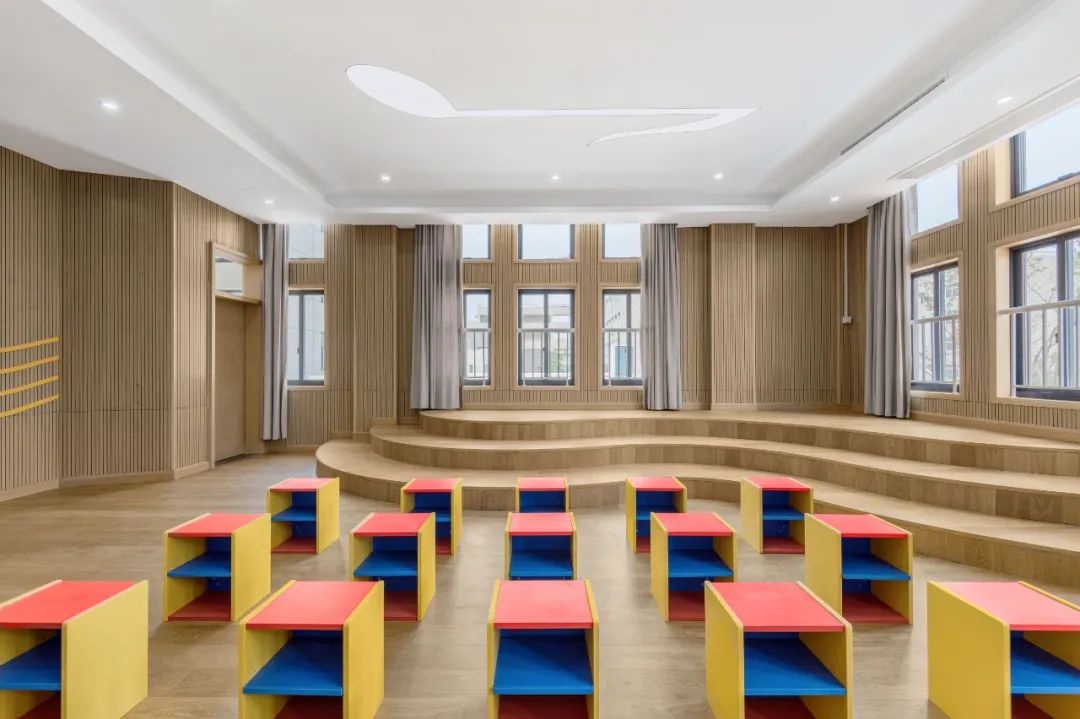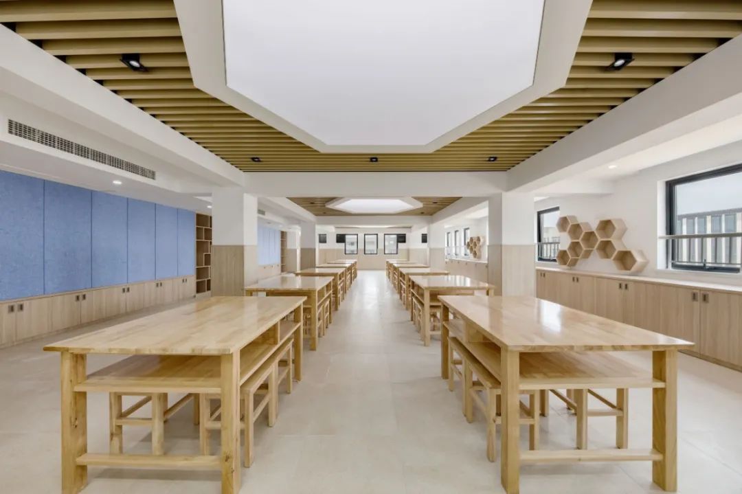 从图书馆改为满足不同教学功能的教室,功能和隔音也是融信需要解决的。在音乐、舞蹈教室等需要隔音的空间中,融信摒弃了常使用的木质吸音板,选择了吸音降噪效果更好的陶镁吸音板,防火及环保性能也更高。