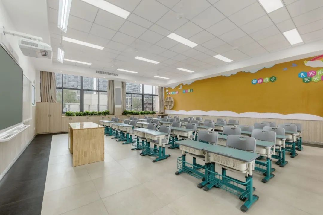 在改建后,每个班级教室的面积将近80平方,满足40-45人教学空间,融信还为每个教室都配备了书包柜、卫生柜、造型书柜、洗手水池、直饮水机。