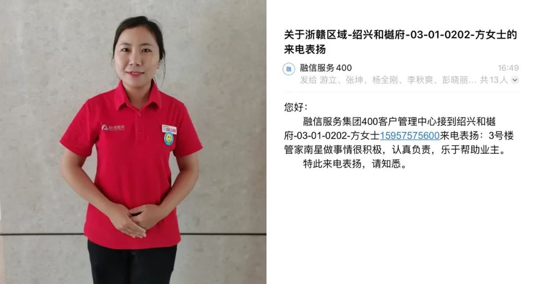 近日,浙江绍兴和樾府业主通过400服务热线传来对融信物业员工王超楠的表扬,字里行间饱含着充分的认可,王超楠自入职以来不断细心学习,从一开始毫无经验的客服小白,一步步走来成为有担当有责任有热心的管家。400热线电话,不仅仅是问题反馈的通道,还可以成为表扬之径,业主给与的每声表扬都是对项目工作人员服务的直接肯定,激励着我们砥砺前行,为此融信物业将继续从点滴做起,用心用情着力解决居者的身边事,持续输出“融信温暖”。