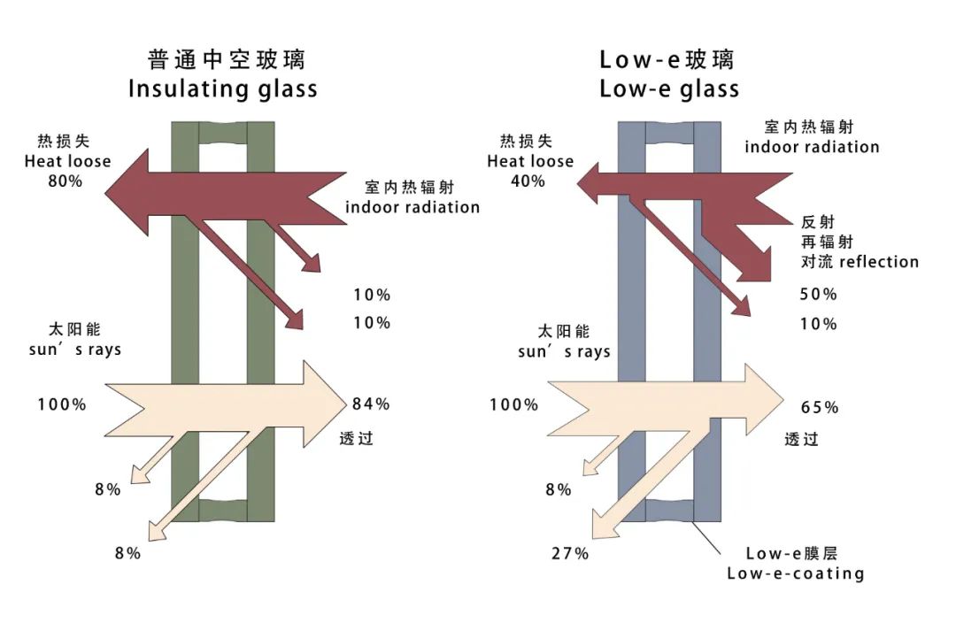 其实,在中国文人的笔下,本该属于建筑范畴的窗子,始终都有一种与审美相关的附加功能,如“当窗理云鬓”、 “何当共剪西窗烛”等语,都让窗户,与美人和情感产生了无法分割的关联。这也证明,除了最基本的通风采光、保温隔热和防盗等功能外,窗子在人们的居住环境中,是取景框景的“器具”,是主人视线的延伸,是空间的“镜头”,也是充满智慧和美感的审美符号。据考证,上古以来,“窗”是专指开在屋顶上的天窗,而开在墙壁上的,应称“牖”,室内北面的窗子,则专称为“向”。除了这种名称上的“细分”,窗在中国的发展,也和文明的演进相同步。我们所知道的最早的窗,是半坡人在方形房子上的屋顶上开始的,也叫“囱”。因采光和防雨性能的不足,原始居民渐渐将“囱”从屋顶转移到了墙体上。到了先秦时代,中国的门窗仍十分简陋,根据《淮南子·说山训》“受光于隙,照一隅;受光于牖,照北壁;受光于户,照室中无遗物”等文字记载,我们可以推测,当时的房屋在建造上,也是坐北朝南,门与窗的设置方向,与此后千年的建筑传统比较一致,而狭小的牖,采光效果应十分有限。汉代到唐代时期,窗有了进一步发展,根据西汉时期出土的文献资料及墓室考古发现,直棂窗等注重实用功能的,可以增大开启面积的简单窗式开始广泛应用,网纹、琐纹及球纹等窗棂纹样也渐渐出现,但此时因造纸技术尚未成熟,那些布景不严谨的影视剧中常常出现的“窗户纸”,要在数百年后才能用于窗户。到了宋元,一种集门、窗功能为一体的“格门窗”开始流行,栏槛钩窗、落地长罩及隔扇窗等窗户类型大量涌现,从这时起,窗正式成为中国传统建筑之眼,是美化建筑主体、展示精致审美意趣的重要构成。到了明清明代,由于皇家把建筑的间数,看作等级地位的象征,在故宫的窗上,我们仍可以看到这些以油漆彩绘的窗子有怎样矜骄炫目的“贵气”,也是在此时的民间,装饰有井字文、龟锦纹等图案,并往往应用了浮雕、透雕工艺的窗棂格,其图案的复杂精致,达到了传统门窗的高峰。在近代社会,传统以木头为主要材质的中国窗子也变得更加“潮流”了,在西方建筑形制、玻璃合金材质的“舶来”影响下,窗在材料、造型、面积、功能上,与世界全面接轨。而在一衣带水的“近邻”日本,长期以中国为师,让日本传统门窗显现出了“唐风”交织“和风”的独特韵致。到了近现代,更早“维新”的日本,则在窗子的设计营建上,发展出了新的特色。近年来,日本发展出了设置室内窗户的潮流。这种颇有匡衡“凿壁偷光”遗韵的室内窗,不是纯粹的装饰摆件,而是专门针对日本家庭那种窄面宽、长进深的房子思考出的装修方案:通过室内窗,可以让采光最好的客厅和主卧,把光“借给”其他房间,并形成一种光线和声音的“流通感”。这种设计,也成为国内小户型一致“偷师”的诀窍。对于习惯了高楼大厦的城市居民,尤其是经常出没写字楼的人们来说,一种被称之为“芝加哥窗”的窗户便非常熟悉。这种窗户中间采用固定大玻璃窗,两侧是较小但可以上下拉动的滑窗,不仅为室内提供更好的自然采光和通风效果,也有助于让立面保持统一简洁的视效风格,其常应用于高层现代建筑,甚至构成了我们对 “城市现代性”理解的第一印象。一般来说,人们都希望房子自带“冬暖夏凉”的属性,而门窗,对此负有重要责任。除了窗子本身的大小和材质、工艺之外,Low-E玻璃、断桥铝材,也在这个愿望当中,扮演着重要的作用。通俗地说,Low-E像是一个“守门员”,拥有决定不同波长的射线能否”登堂入室”的权限。所谓Low-E的“E”,全称就是Emissivity,即辐射系数。低辐射系数的玻璃有普通玻璃优秀的透光性,同时也把普通玻璃0.84的辐射效率,可最低降到0.15。而实现这种神奇“魔术”的关键,在于镀上的以银元素为基础的薄膜,它可以把携带热量的中远红外线、紫外线,高效辐射,但可见光却能被“顺畅地放行”。——Low-E玻璃原理示意图